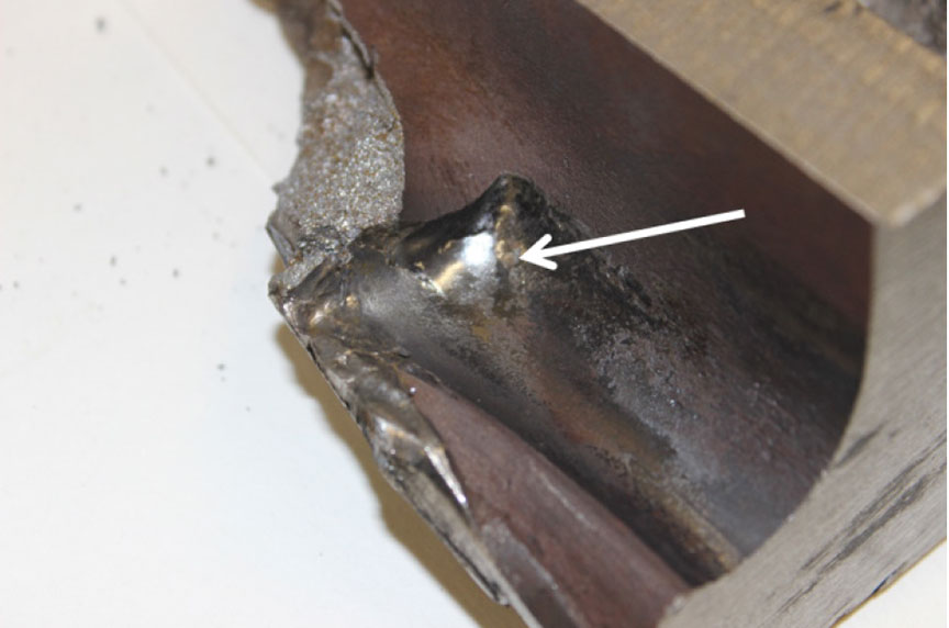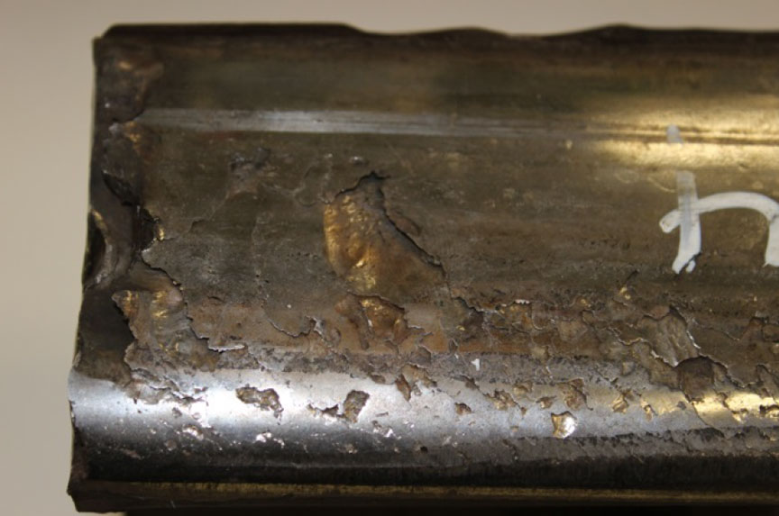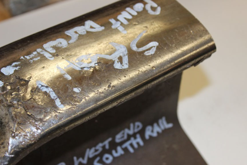 - Le côté intérieur du champignon du rail présentait des criques du champignon et de l'écaillage, anomalies dont on sait qu'elles mènent à la formation de défauts transversaux. Il n'a pas été possible de déterminer si la rupture du rail a été causée par un défaut transversal, car la surface de rupture du champignon du rail a subi d'importants dommages d'impact.
