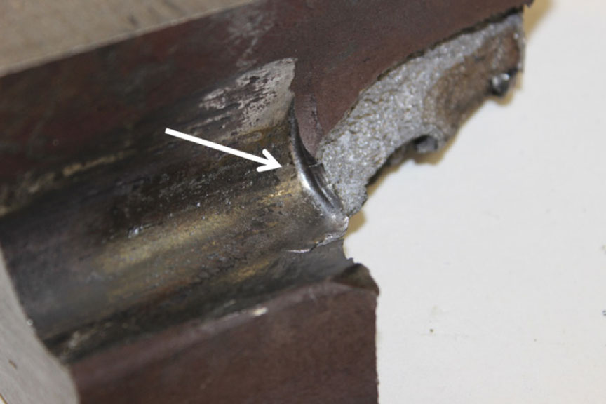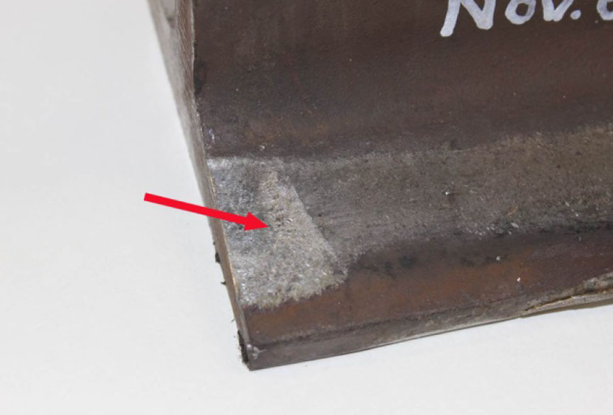 - Les 2 morceaux de rail présentaient une usure verticale du champignon de 7/16 po. Les côtés intérieur et extérieur du rail présentaient une usure de +1/16 po et +3/16 po, respectivement. Dans le cas des 2 morceaux de rail, cet écart était causé par la formation d'un fluage du métal du côté intérieur et par la déformation du côté extérieur (figure 4). À mesure que le rail s'usait, il s'élargissait vers l'intérieur et l'extérieur.
