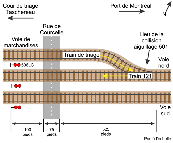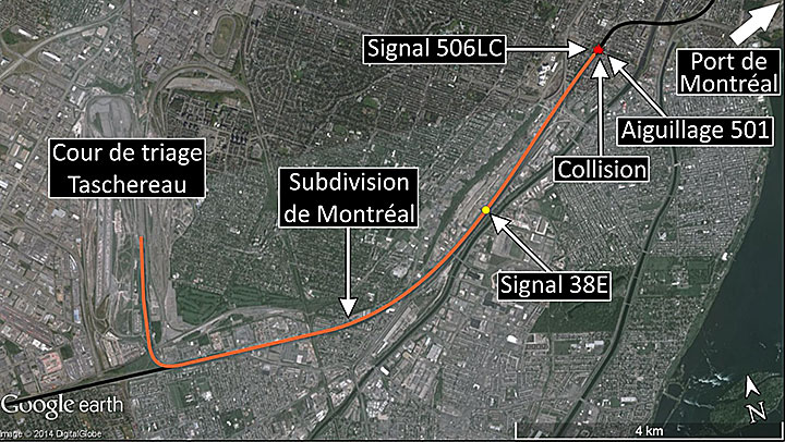Les mouvements vers l'est qui approchent de l'aiguillage 501 rencontrent le signal d'approche 38E, puis le signal 506LC. Le signal d'approche 38E est visible à 3600 pieds et le signal 506LC, à 1500 pieds. Ces distances de visibilité étaient suffisantes pour permettre à l'équipe du train de triage de voir les signaux, de les identifier et de s'y conformer. L'examen des enregistrements du système de CCC n'a révélé aucune anomalie de fonctionnement des signaux. Le signal 506LC à Saint-Henri exhibait une indication d'arrêt. Le chef de train (Cdtr) et le Cdtr adjoint avaient identifié le signal 38E et avaient confirmé entre eux qu'il indiquait « de vitesse normale à arrêt ». Vu le résultat de l'essai des freins en marche, l'équipe n'avait pas besoin de réduire la vitesse du train pour être en mesure d'arrêter le train si le signal 506LC indiquait « arrêt ». En effet, l'équipe était en mesure de continuer à une vitesse de 15 mi/h jusqu'à ce que le signal 506LC entre dans son champ de vision, puis de réagir en conséquence. Cependant, l'indication d'arrêt affichée par le signal 506LC n'a pas été perçue par le Cdtr et, par conséquent, les mesures pour s'y conformer n'ont pas été prises. Le train de triage a franchi le signal 506LC alors qu'il indiquait un signal d'arrêt, s'est engagé sur l'aiguillage 501 et est entré en collision avec le train 121, qui circulait sur la voie adjacente.