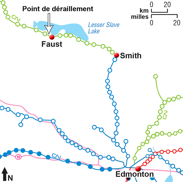 Le 11 juin 2014 à 15 h 30, heure avancée des Rocheuses, les 20 derniers wagons du train de marchandises A41851-11 du Canadien National circulant vers l'est ont déraillé au point milliaire 202,3 de la subdivision de Slave Lake à Faust (Alberta). Les 17 derniers wagons du train étaient des wagons-citernes contenant des résidus de carburant diésel (UN 1202). Il n'y a eu aucun déversement de produits ni aucune blessure. Un tronçon d'environ 1200 pieds de la voie a été endommagé.