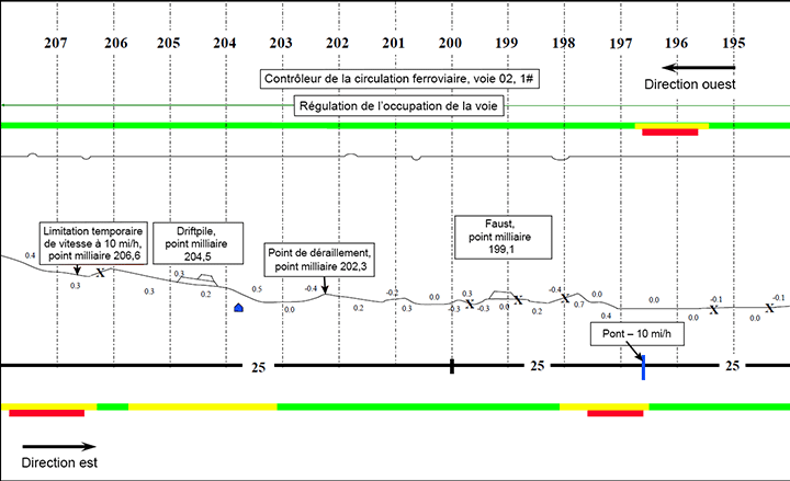 Dans les environs du lieu du déraillement, la voie est une voie principale simple en alignement orientée d'est en ouest. Dans la direction du déplacement (vers l'est), il y a une pente descendante d'entre 0,2 % et 0,5 % entre les points milliaires 206,0 et 203,5. Ensuite, la voie est en palier sur une distance d'environ 1 mille (entre les points milliaires 203,5 et 202, 5), puis elle amorce une courte pente ascendante de 0,4 % (figure 3).