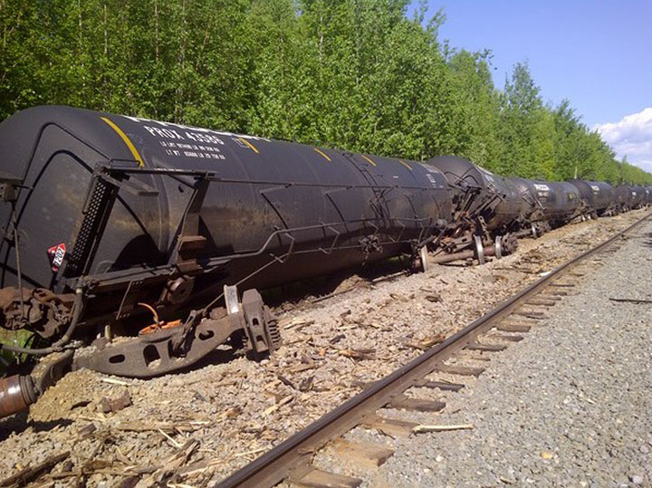 Les 20 wagons ont tous déraillé du côté nord de la voie. Les wagons 107 à 120 ont déraillé à la verticale, les wagons 121 et 122 se sont inclinés, et les 4 derniers wagons (123 à 126) se sont renversés (photo 4). Le wagon 107 était chargé de produits du bois. Les wagons 108 et 109 étaient des wagons-trémies vides, et les 17 derniers wagons déraillés étaient des wagons-citernes (DOT 111A100W1) contenant des résidus de carburant diésel (UN 1202).