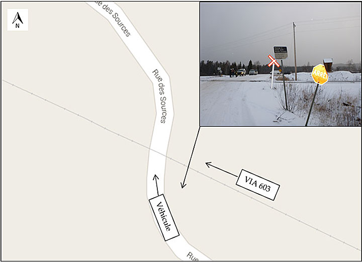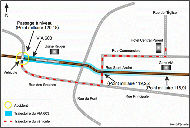 Quelque 5 minutes après être parti de la gare de Parent, le VIA 603, qui approchait du passage à niveau privé de la rue des Sources au point milliaire 120,18 à une vitesse de 43,2 mi/h, a utilisé son sifflet, conformément à la réglementation. Les feux de fossé étaient allumés et les phares avant de la locomotive étaient allumés à puissance maximale. L'équipe a remarqué une camionnette (véhicule) roulant vers le nord qui semblait ralentir mais qui a ensuite accéléré pour franchir le passage à niveau.