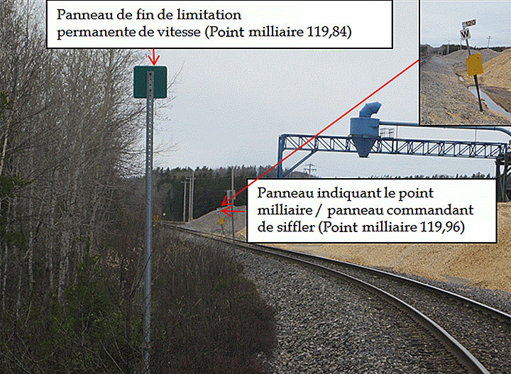 Étant donné que l'indication du point milliaire et le panneau de fin de limitation de vitesse auraient dû être situés au point milliaire 120 et que le panneau commandant de siffler aurait dû être situé au point milliaire 119,93, le mauvais emplacement de ces panneaux a été une source de confusion parmi les membres de l'équipe au sujet de l'exploitation du train. En raison de cette confusion, le train roulait à 37,1 mi/h lorsque sa queue a atteint la fin de la limitation de vitesse de 10 mi/h. Pour s'assurer que l'exploitation des trains se fasse en toute sécurité, les panneaux ferroviaires devraient être correctement situés et visibles de façon à ce qu'ils soient bien identifiés. Des panneaux ferroviaires qui ne peuvent être correctement identifiés ou qui sont situés au mauvais endroit peuvent entraîner de la confusion parmi les membres de l'équipe de train ou un manque d'uniformité dans l'application des règles, ou les deux, ce qui augmente les risques d'exploitation, surtout dans les environs des passages à niveau.