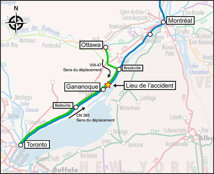 Avant l'accident, le parcours de chaque train s'était déroulé sans incident. Vers 14 h 15, le CN 368, roulant vers l'est à quelque 53 mi/h sur la voie principale nord de la subdivision de Kingston du CN, a actionné l'alarme du détecteur de pièces traînantes au point milliaire 151,64, juste à l'est de Gananoque (Ontario). Alors que l'équipe du CN 368 ralentissait son train, il s'est produit un serrage d'urgence intempestif. Les procédures d'urgence ont été suivies, et l'équipe a immédiatement lancé un message radio d'urgence.
