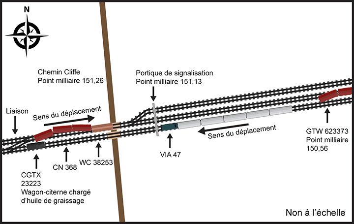 - Le train de voyageurs no 47 (VIA 47) de VIA Rail Canada Inc. (VIA) avait ralenti à 51 mi/h et le train de marchandises M36831-01 du Canadien National à 11 mi/h lorsque l'arrière (bout A) du wagon GTW 623373 a heurté l'avant de la locomotive du VIA 47 et a éraflé son côté nord et celui des 5 voitures-coachs de VIA.