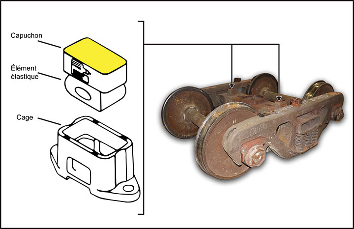 Le wagon GTW 623373 était équipé de bogies Barber S2 standards munis de CCSB à course normale de marque Miner. Ce type de CCSB est formé de 1 élément élastique, de 1 capuchon de métal et de 1 cage (figure 4).