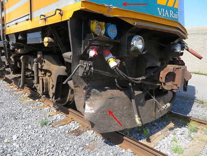 Le VIA 47 s'était immobilisé avec sa partie avant située aux environs du point milliaire 151,13. Le côté nord de la locomotive de VIA (photo 1) et des 5 voitures-coachs était endommagé. Le réservoir de carburant de la locomotive de VIA était perforé jusqu'à environ la mi-hauteur de son coin avant et avait déversé quelque 1000 litres de carburant diesel.