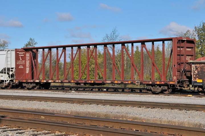 Les wagons plats à poutre centrale mesurent environ 80 pi de long et sont relativement légers à vide (photo 2). Ce type de wagon comporte à chaque bout une paroi qui empêche les chargements de se déplacer et, en son centre, une poutre intégrée à la longrine centrale pour arrimer les chargements. Ces wagons sont moins rigides en torsion que les autres types de wagons et sont connus pour être plus sujets à un mouvement de galop du bogie quand ils sont vides.