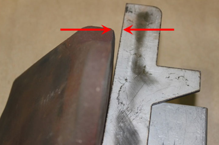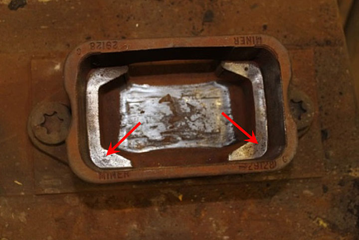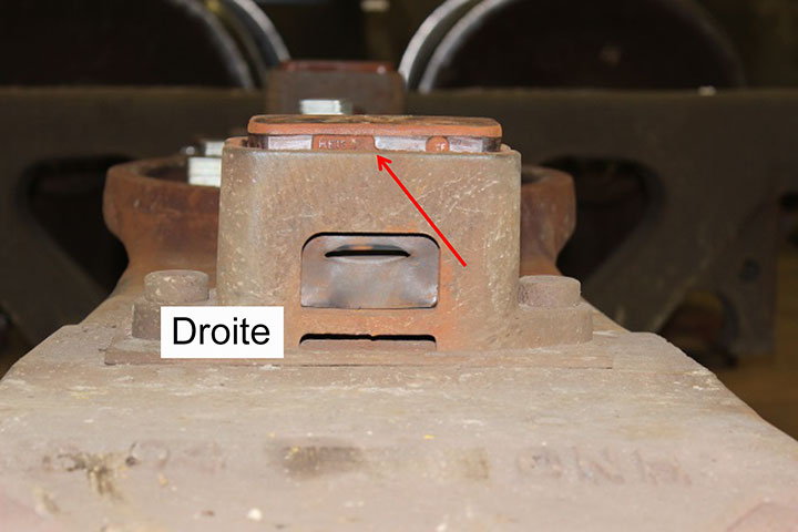 - À cause de leur usure, les 2 patins stabilisateurs moulés avaient pris une forme convexe, tandis que les surfaces de contact correspondantes des plaques d'usure sur les colonnes du longeron avaient revêtu une forme concave. Cette usure suggère que le bogie présentait une résistance réduite au gauchissement (photo 3).