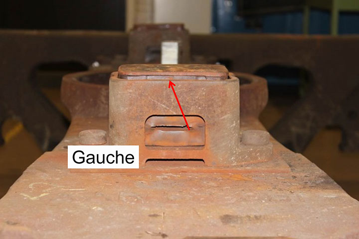 - L'usure observée sur les CCSB, leurs cages et les glissoirs de caisse correspondants était compatible avec l'usure constatée sur les bogies munis de CCSB qui ont perdu leurs caractéristiques d'amortissement. En particulier, les projections dans la cage du CCSB étaient polies, une indication que le glissoir s'était affaissé (photo 6).