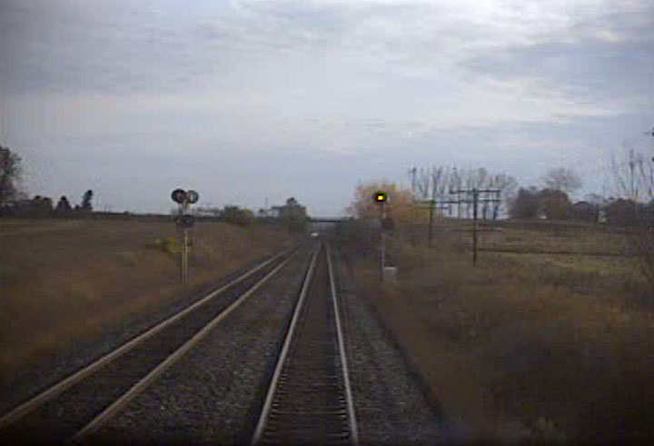 - Pendant la marche du train à quelque 90 mi/h, une teinte verteNote de bas de page 6 était visible à travers la ligne de poteaux, durant environ 1 seconde, à un endroit juste à l'ouest du signal avancé sur la voie sud. (Nota : L'endroit en question se trouve là où le signal est normalement reconnu et annoncé.)