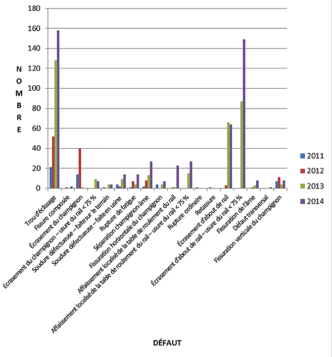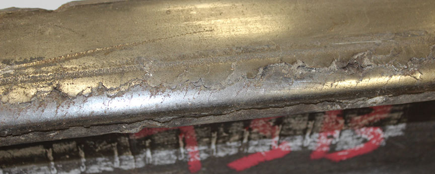 Les 2 rails étaient rompus au point milliaire 74,58. Les morceaux du rail sud montraient des marques d'impact à leur extrémité ouest. Un défaut transversalNote de bas de page 4 était présent sur 1 des surfaces de rupture. La surface de rupture correspondante n'a pas été récupérée. De plus, des microfissures de surface du champignonNote de bas de page 5, des écaillesNote de bas de page 6 et un certain nombre d'affaissements localisés de la table de roulement du rail (LSC)Note de bas de page 7 étaient également présents sur le rail sud. L'usure verticale sur le champignon du rail était de ¼ pouce. Quatre morceaux du rail sud ont été récupérés et envoyés au laboratoire du BST à des fins d'examen plus poussé.