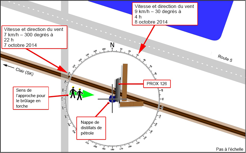 - Les wagons GATX 82043 et PROX 126 contenaient des distillats de pétrole, classe 3, groupe d'emballage (GE) III. Les 2 wagons se sont rompus et leur contenu a brûlé à l'air libre dans l'incendie et l'activité de brûlage en torche qui ont suivi.