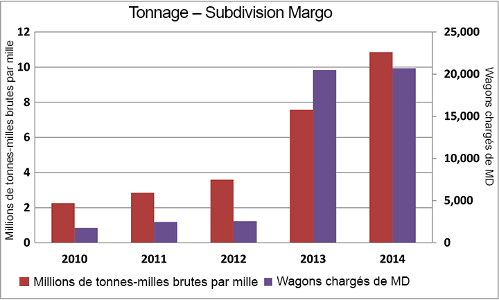 Le 7 octobre 2014, le train a quitté Canora vers 6 h 5. Il était composé de 3 locomotives, 40 wagons chargés, 53 wagons vides et 7 wagons-citernes de résidus. Il pesait 6727 tonnes et mesurait 6142 pieds de long. L'équipe de train se composait de 1 mécanicien de locomotive et 1 chef de train. Tous deux étaient qualifiés pour leur poste respectif, répondaient aux normes d'aptitude au travail et de repos, et connaissaient bien la subdivision.