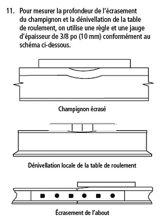 Au cours de l'examen des lieux, on a inspecté les roues des wagons en tête du train qui n'avaient pas déraillé. Les roues du 31e wagon (DOWX 3282), un wagon-citerne de MD chargé d'éthanolamine (UN 2491), présentaient des marques d'impact sur leur table de roulement (photo 2).