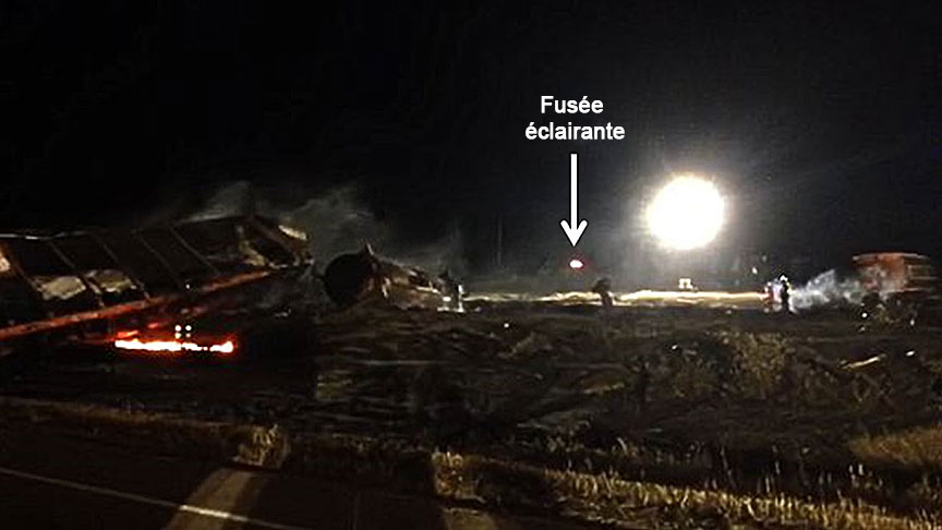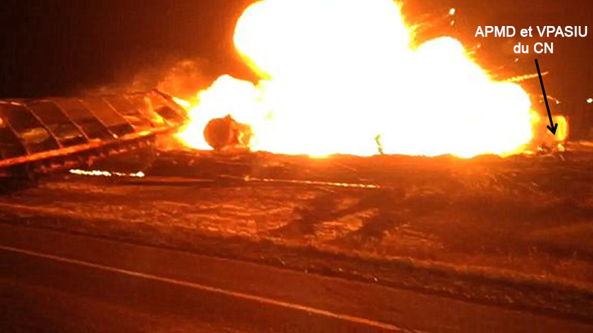 Le 7 octobre 2014 vers 11 h 35, heure normale du Centre, le train de marchandises A40541-05 du Chemin de fer Canadien National (CN) roulait vers l’ouest sur la subdivision Margo du CN quand 26 de ses wagons ont déraillé, dont 6 wagons-citernes chargés de marchandises dangereuses, au point milliaire 74,58, près de Clair (Saskatchewan). Deux des wagons, qui étaient chargés de distillats de pétrole (UN 1268), ont déversé leur produit, qui a pris feu par la suite. Par mesure de précaution, on a évacué une cinquantaine de résidents dans un rayon de 2 milles et fermé la route provinciale 5. La voie a été détruite sur quelque 650 pieds. Il n’y a eu aucun blessé.