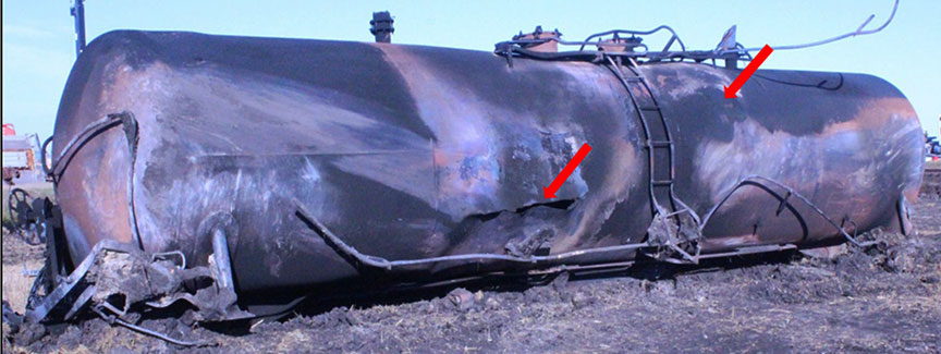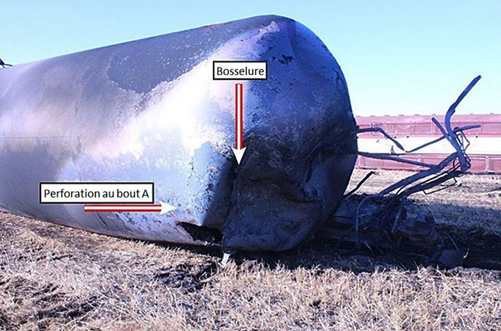 Le wagon-citerne GATX 82043 a subi des dommages d'impact à la coque et à la tête du bout A, ce qui a provoqué un déversement de produit. Le produit déversé s'est enflammé et a nourri le feu en nappe qui a suivi le déraillement. Le wagon-citerne PROX 126, qui est resté dans le feu en nappe, a subi 2 ruptures thermiques. La quasi-totalité du contenu de ces 2 wagons s'est consumée dans le feu.