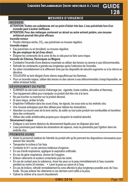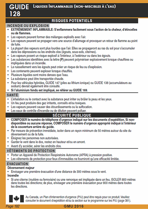 Le styrène monomère, stabilisé (UN2055) est un liquide inflammable de classe 3 faisant partie du groupe d'emballage (GE) III en vertu du Règlement sur le transport des marchandises dangereuses Note de bas de page 7. Ce produit est non miscible dans l'eau (c'est-à-dire qu'il ne se mélange pas avec de l'eau). Le Guide des mesures d'urgence (GMU) de Transports Canada (TC) renvoie les premiers intervenants au guide 128 (annexe A)Note de bas de page 8, référence qui aide les premiers intervenants à prendre les décisions initiales à leur arrivée sur les lieux d'un accident en présence de matières dangereuses.
