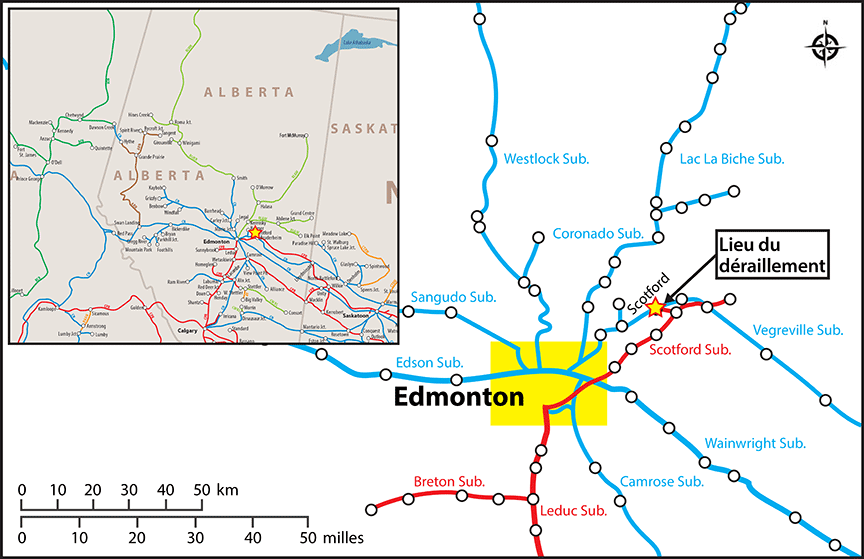 Le 8 décembre 2015, la manœuvre AS-01, qui était conduite au moyen d'un système de télécommande de locomotive (STL) et employait 2 locomotives, circulait à l'extrémité ouest du triage Scotford du Chemin de fer Canadien Pacifique (CP) à Scotford (Alberta) (figure 1). Le triage Scotford se trouve au point milliaire 138,1 de la subdivision Scotford. La manœuvre, dont le point d'origine était le triage Scotford, desservait des compagnies pétrochimiques de la zone industrielle locale.