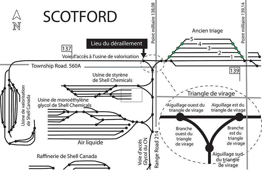 Ce matin-là, en revenant de l'usine de valorisation, l'équipe avait décidé d'utiliser le triangle de virage pour inverser le mouvement et réorienter le groupe de traction de sorte que les locomotives de commande pointent vers l'ouest. L'équipe préférait manœuvrer avec les locomotives dans cette position. Comme aucune règle n'obligeait de remettre l'aiguillage ouest du triangle de virage dans sa position de départ après qu'elle eut bifurqué sur la voie d'accès Glycol du Canadien National (CN), l'équipe a laissé l'aiguillage en position renversée. L'équipe n'envisageait pas alors la nécessité d'un autre déplacement vers l'ouest sur la voie d'accès à l'usine de valorisation au-delà de l'aiguillage ouest du triangle de virage.