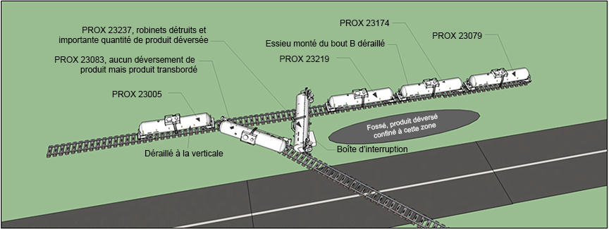 - Le déraillement est survenu lorsque le mouvement a franchi en marche arrière l'aiguillage ouest du triangle de virage, qui était endommagé.