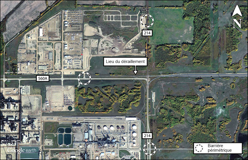Des équipes de sécurité de la Gendarmerie royale du Canada et de Shell Canada ont établi des barrages routiers aux deux extrémités du chemin de rang 214 et du chemin de canton 560A pour contrôler l'accès au lieu (figure 8). Néanmoins, très tôt le 9 décembre 2015, une équipe de nouvelles télévisées s'est introduite illégalement sur le lieu du déraillement par le chemin de canton 560A. Les journalistes ont pris des photos avant d'être expulsés du lieu. Ils ont pénétré dans la zone chaude, mais l'étape d'urgence de l'intervention était passée. Les membres de l'équipe de nouvelles n'ont fait état d'aucun effet nocif comme suite à leur exposition au styrène monomère. Il n'y a eu aucun autre accès non autorisé à la zone chaude.