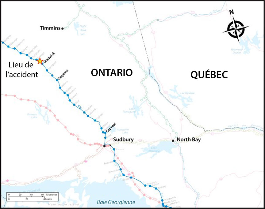 Vers 23 h 35, alors que le train circulait à environ 38 mi/h, un freinage d'urgence provenant de la conduite générale s'est produit à Gladwick (point milliaire 111,7), près de Gogama (Ontario; figure 1). En regardant vers l'arrière, l'équipe du train a vu une grosse explosion et le début d'un incendie. Elle a suivi les procédures d'urgence et lancé le message radio requis. Après l'arrêt du train, l'équipe a dételé les locomotives et les 6 premiers wagons, et a avancé vers l'est jusqu'à un endroit sûr, à l'écart de l'incendie. Il n'y a eu ni blessures ni évacuation.