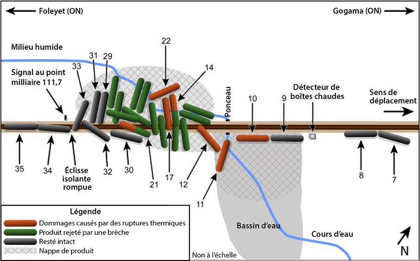 • Des 7 wagons-citernes qui ont subi des ruptures thermiques, 2 ont également subi des brèches de coque et à la tête (les 14e et 21e wagons, respectivement).