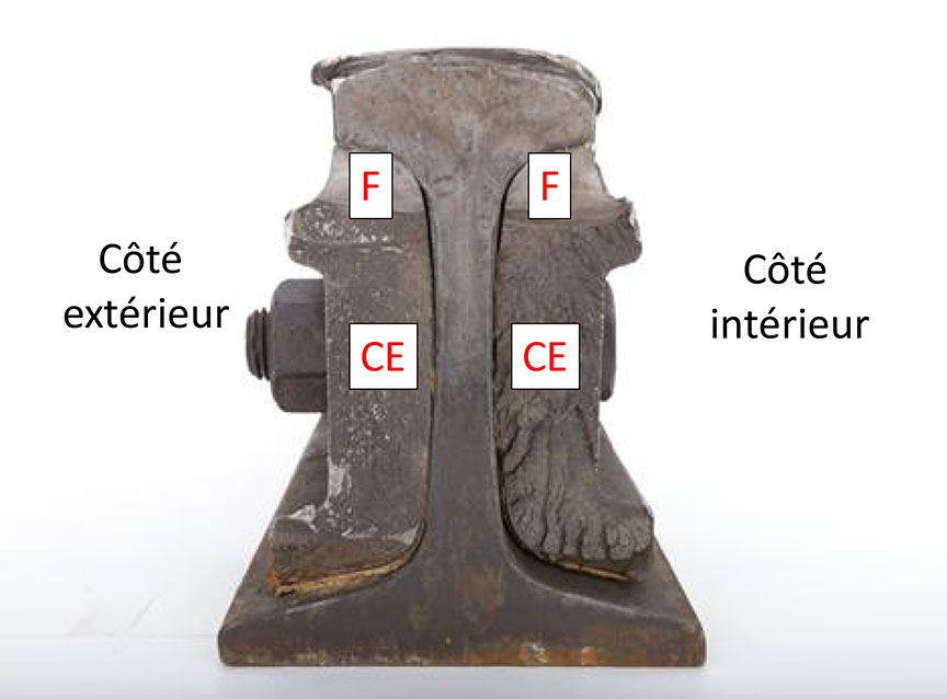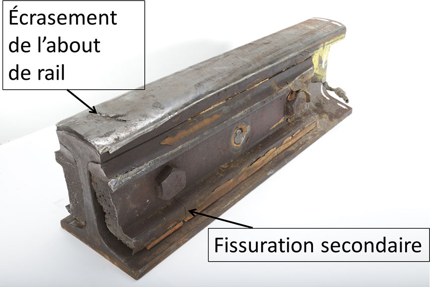 Les 2 éclisses se sont brisées en 2 morceaux. On n'a pas retrouvé la partie est des éclisses, mais leur partie ouest est demeurée fixée au rail. On a observé l'écrasement du champignon aux abouts de rail de la partie récupérée du joint. Le dessus des parties restantes des éclisses présentait des ondulations de fatigue, lesquelles constituent un signe de défaillance par fatigue. Selon les renseignements inscrits sur l'âme du rail, un contrôle des défauts de rail à l'aide de la voiture d'auscultation des rails (Sperry) le 18 janvier 2015 avait permis d'identifier des écrasements aux abouts de rail de 3,5 mm au point milliaire 111,7.
