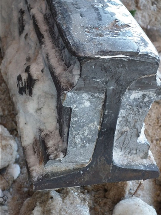 Partie ouest du joint isolant comprenant les éclisses brisées et le rail intact récupérés sur le lieu du déraillement