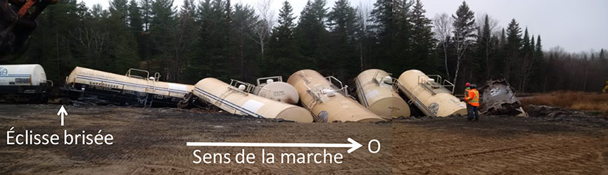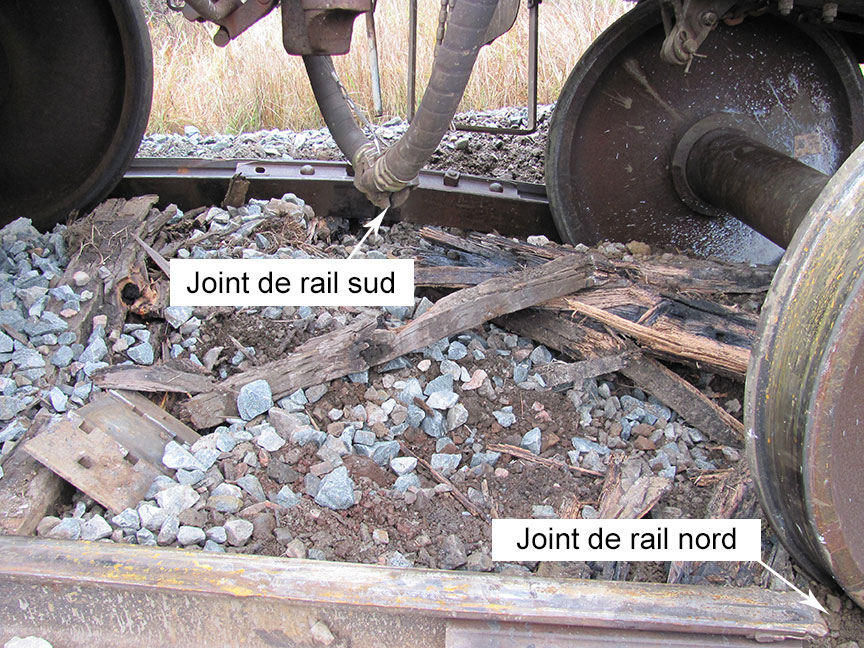 Dans le sens de la marche, les premières marques sur les rails étaient situées au point milliaire 72,08, à la hauteur de 2 joints de rail adjacents sur les rails nord et sud, décalés de moins de 5 pieds (photo 1). Le joint de rail nord était brisé en deux. Sa partie est était en place, toujours munie de ses éclisses brisées et sa partie ouest se trouvait sous les wagons déraillés, toujours munie de ses éclisses brisées. Le joint de rail sud était resté intact et s'était renversé vers l'extérieur. Les deux joints de rail ont été récupérés et acheminés au Laboratoire technique du BST pour y subir un examen détaillé.