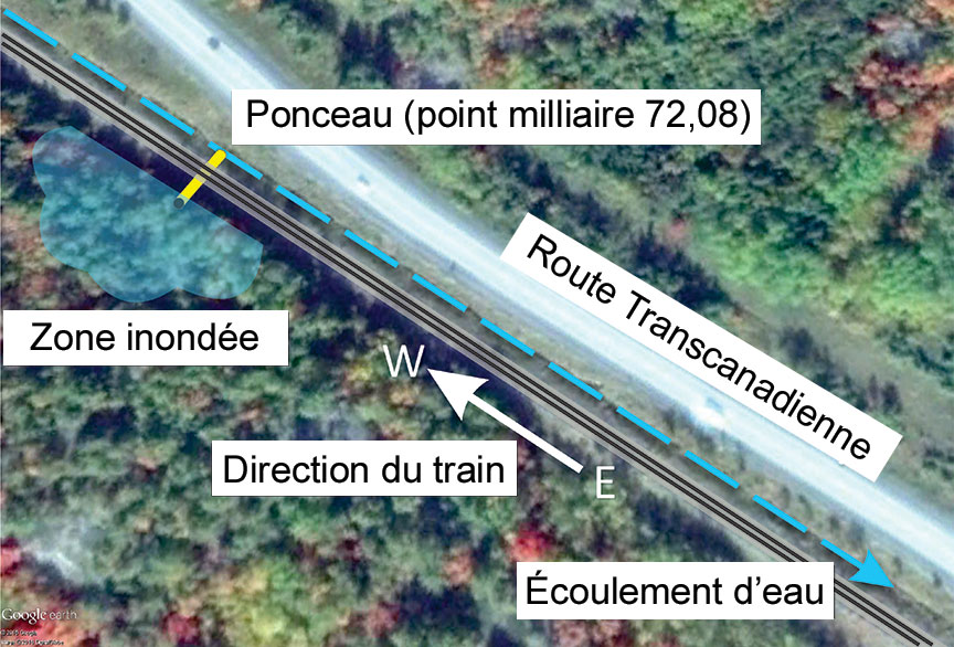 - Le drainage, qui s'effectuait normalement du côté sud au côté nord de la voie, avait été restreint ou complètement bloqué, malgré la présence d'un ponceau au point milliaire 72,08.