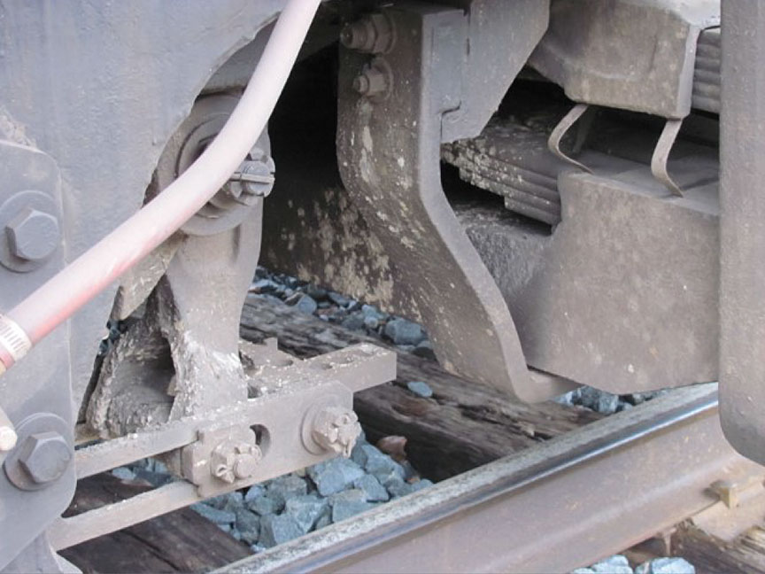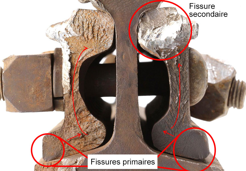 - L'instabilité de la plateforme, de concert avec les charges d'impact des roues des wagons amplifiées par les joints non décalés, avait augmenté les déflexions à la hauteur des joints de rail, amorçant ainsi des fissures de fatigue à l'intérieur des éclisses.