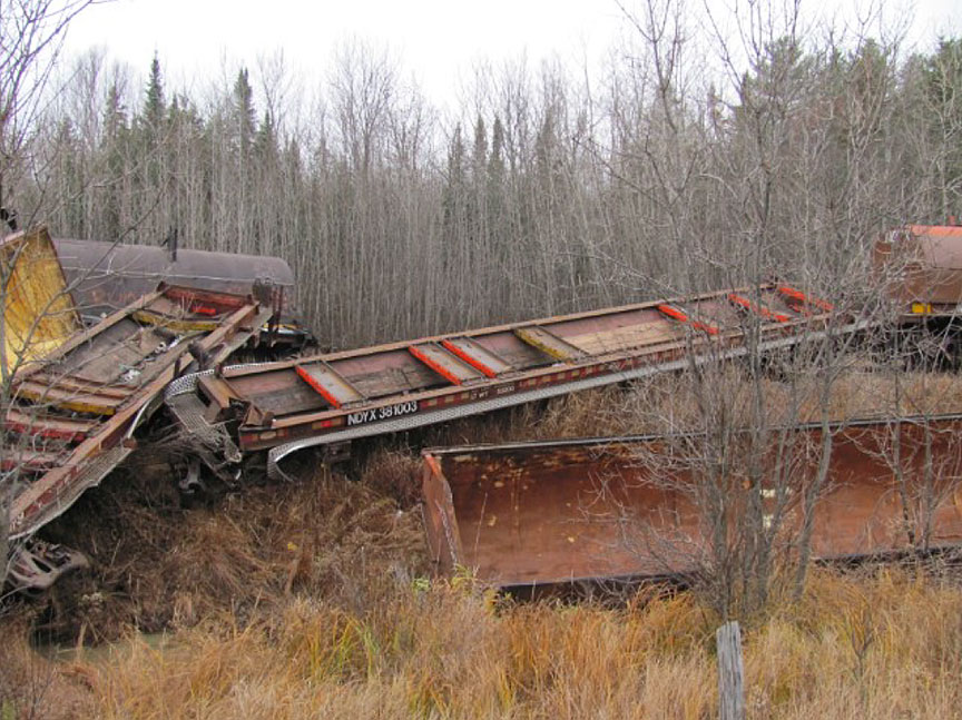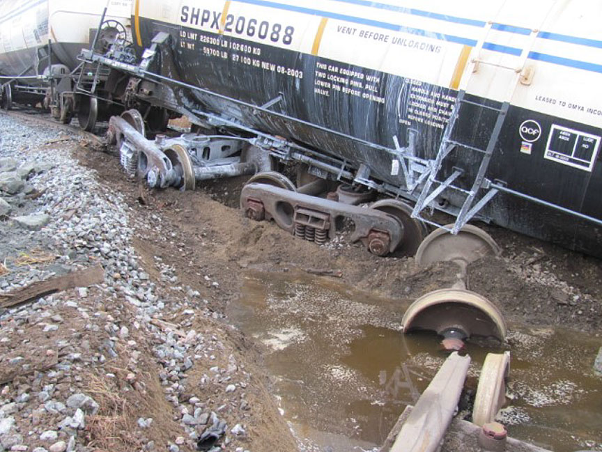 Les 3 locomotives de tête ont déraillé, se sont séparées du train et immobilisées à environ 115 pieds à l'ouest d'un groupe de wagons déraillés. Les 8 premiers wagons, tous des wagons-citernes, ont déraillé et se trouvaient à l'intérieur d'une brèche où la plateforme de la voie s'était affaissée. Cinq autres wagons, des wagons-tombereaux couverts qui occupaient les positions 24 à 28 depuis la tête du train, ont déraillé eux aussi. Aucune marchandise dangereuse n'a été en cause et personne n'a été blessé.