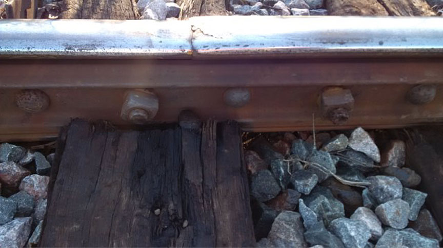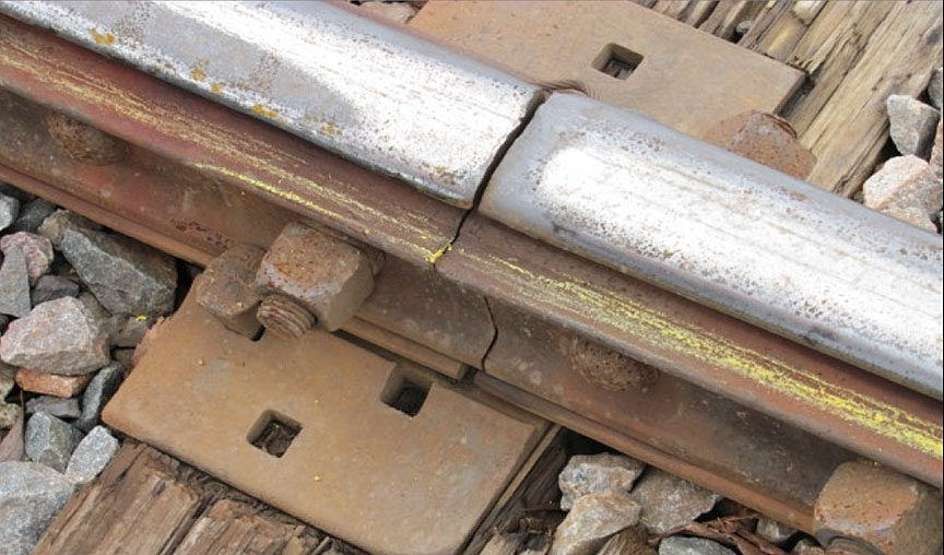 - Au passage du train de marchandises, le joint préfissuré du rail nord s'est rompu par suite d'une rupture par contraintes excessives à mesure que la couche supérieure de plateforme s'est affaissée.