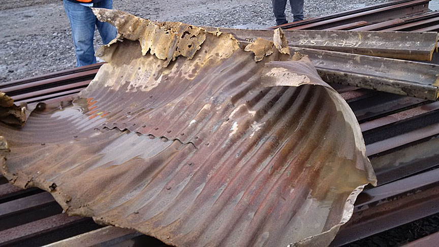 - Les rallonges de tuyau en acier ondulé étaient corrodées et rouillées de part en part sur de grandes surfaces (photo 8) et s'étaient séparées du dalot de béton, ce qui avait permis au matériel de la couche supérieure de plateforme de tomber dans les interstices.