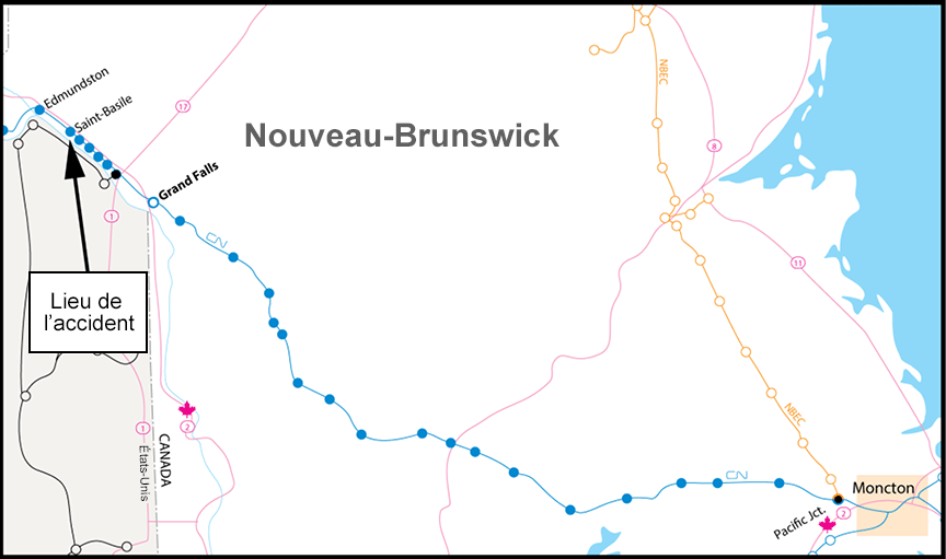 Le 17 avril 2015, vers 14 h 50Note de bas de page 1, le train de marchandises M30511-17 des Chemins de fer nationaux du Canada (CN) en provenance de Moncton (Nouveau-Brunswick), roulait vers l'ouest dans la subdivision de Napadogan, à destination de Toronto (Ontario). Le train roulait à 46 mi/h lorsque 35 wagons et 1 locomotive à traction répartie (LTR) ont déraillé aux environs du point milliaire 212,8, près de Saint-Basile (Nouveau-Brunswick) (figure 1).