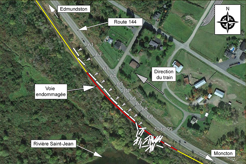 Le déraillement s'est produit dans une zone rurale adjacente à la route 144 (figure 2). Dans cette zone, la voie longe la rivière Saint-Jean qui constitue la frontière internationale entre le Canada et les États-Unis. Les wagons qui ont déraillé se sont immobilisés des 2 côtés de la voie, et beaucoup de wagons ont dévalé le remblai vers la rivière Saint-Jean.