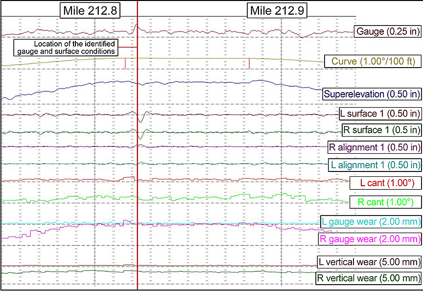 Lors de l'inspection du 15 avril, l'engin TEST a détecté plusieurs défauts dans la courbe où s'est produit le déraillement (tableau 5), y compris 1 défaut de surécartement nécessitant une intervention quasi-urgenteNote de bas de page 5 et 2 défauts de surface nécessitant une intervention prioritaire au point milliaire 212,82.