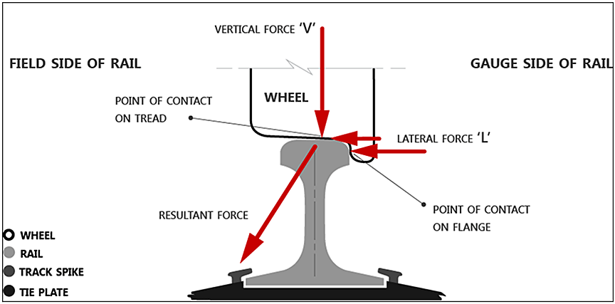 - Les conditions de la voie et le dévers insuffisant de la courbe (pour équilibrer la vitesse des trains) ont donné lieu à des forces latérales plus élevées sur le rail haut.