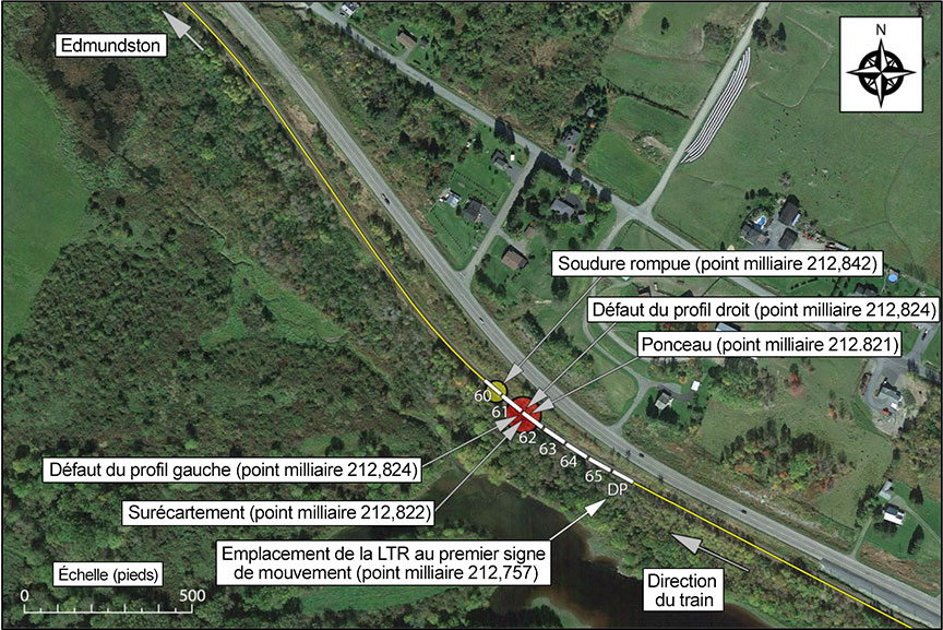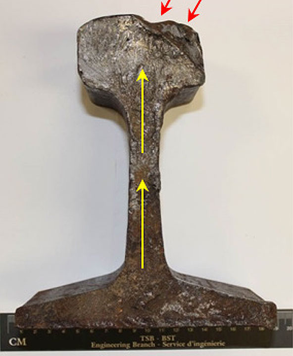 Au cours de la séquence du déraillement (autrement dit, en conséquence du déraillement), le rail s'est rompu au niveau d'une soudure en bout par étincelage du rail nord. La soudure située à proximité du point milliaire 212,84 présentait un dépôt de corrosion plus foncé et un bord arrondi au niveau du patin, ce qui indique qu'elle était partiellement fissurée depuis un certain temps. L'orientation des chevrons et des crêtes sur la rupture en surface indiquait que celle-ci avait pris naissance au niveau du patin de rail, puis qu'elle s'était propagée vers le haut dans l'âme et dans le champignon. Bien que la soudure ait été inspectée régulièrement par des techniques d'auscultation aux ultrasons, le défaut existant (la rupture partielle) était resté inaperçu, puisqu'il se trouvait dans le patin de rail, donc en dehors du champ réfléchissant des techniques actuelles d'auscultation aux ultrasons. Si un défaut existe dans le patin de rail, celui-ci risque alors de ne pas être détecté lors des inspections de détection des défauts de rail, ce qui augmente le risque de déraillement en raison d'une rupture du rail.