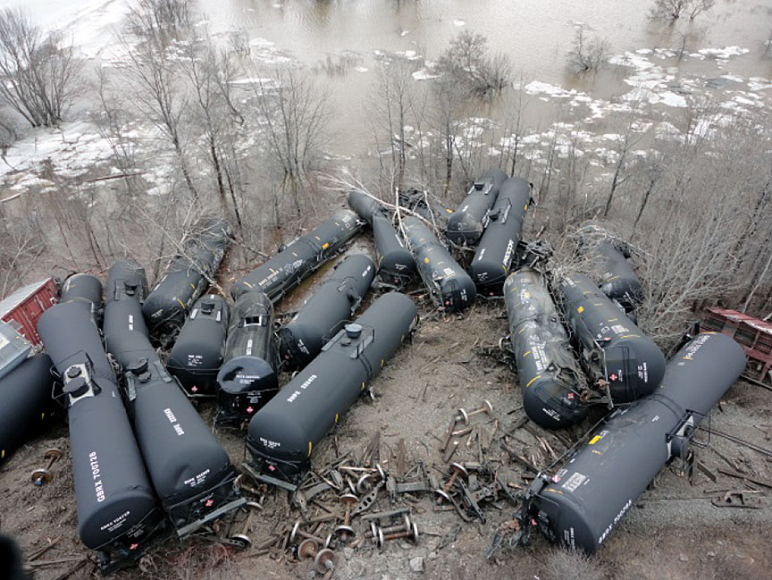 Le 17 avril 2015, vers 14 h 50, heure avancée de l’Atlantique, 35 wagons et 1 locomotive à traction répartie du train de marchandises M30511-17 des Chemins de fer nationaux du Canada, circulant vers l’ouest à 46 m/h, ont déraillé au point milliaire 212,8 dans la subdivision de Napadogan, près de Saint-Basile (Nouveau-Brunswick). Le déraillement a détruit environ 900 pieds de voie principale. Vingt des wagons déraillés étaient des wagons-citernes de résidus de pétrole brut (UN 1267, classe 3, leur dernier chargement). Il n’y a pas eu de fuite et personne n’a été blessé.