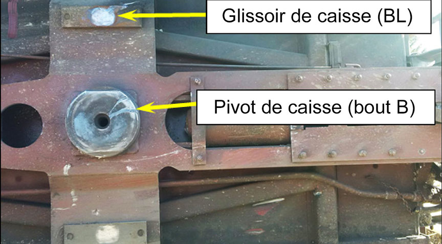 Outre les conditions de la voie, l'enquête a examiné l'état des wagons qui se trouvaient devant la LTR pour déterminer quel rôle, le cas échéant, ils pourraient avoir joué dans le déroulement de l'accident. Les marques irrégulières observées sur les glissoirs de caisse des 2 premiers wagons qui ont déraillé (les 61e et 62e wagons) laissent penser que le contact entre le bogie et les traverses pivots était inégal. Bien que l'observation de la condition d'un glissoir de caisse ne constitue pas une indication fiable du niveau de contact subi, un contact inégal peut augmenter la rigidité rotationnelle du bogie, contribuant ainsi à des forces latérales supérieures s'exerçant sur la voie.