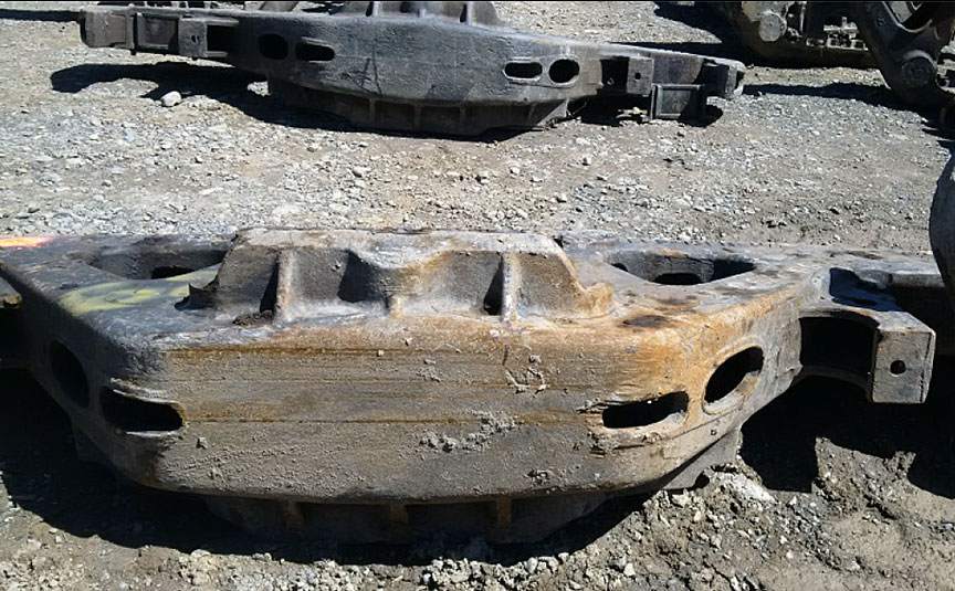 Une importante strie marquait le pivot de caisse à l'extrémité arrière du wagon (bout B). Les stries s'étendaient du trou de la cheville ouvrière, vers l'extrémité du wagon, et légèrement vers le sud (photo 5). Des marques irrégulières de contact ont également été observées sur le glissoir de caisse au même bout, du côté gauche (bout BL). Le corps de l'attelage à l'extrémité arrière était rompu à l'horizontale du côté nord de l'ouverture. Aucun signe n'indiquait la présence d'une importante torsion du bras d'attelage à ce bout.