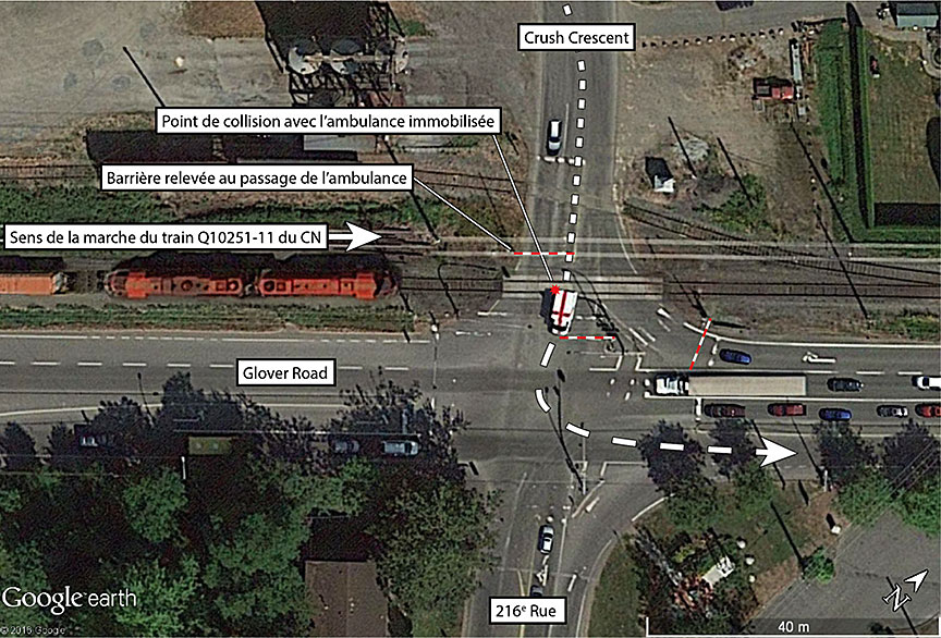 Vers 11 h 20, l'ambulance circulait en direction est sur Crush Crescent avec l'intention de virer à gauche (vers le nord) sur Glover Road. Le feu de circulation du virage à gauche était vert. L'ambulance roulait à faible allure vers le passage à niveau.