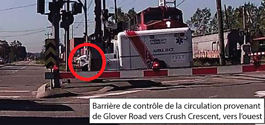• Au moment où l'ambulance approchait de la voie principale, la barrière de contrôle de la circulation vers l'ouest provenant de la 216e Rue et traversant Glover Road pour emprunter la route Crush Crescent avait déjà commencé à descendre.