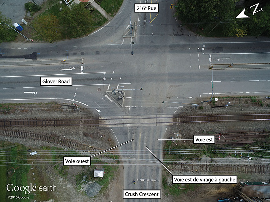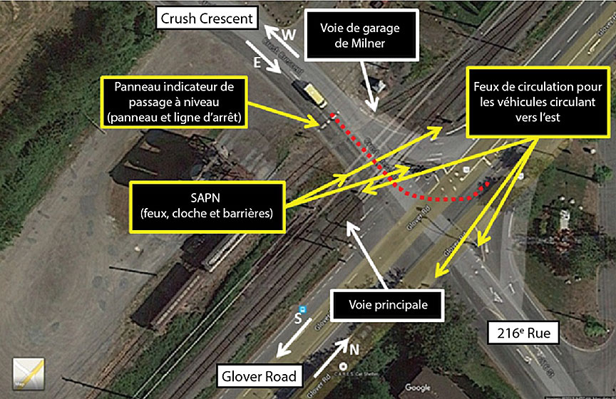 Le passage à niveau de l'événement à l'étude (le passage à niveau) se trouve à Langley, au PM 18,81 de la subdivision Page. Le passage à niveau, qui croise Crush Crescent et est parallèle à Glover Road, est doté d'un SAPN comportant des feux clignotants, une cloche et des barrières. Le SAPN fonctionnait normalement au moment de l'événement. Le système de signalisation du passage à niveau, qui était relié au système de feux de signalisation routière de l'intersection, utilisait un prédicteur pour passage à niveau pour assurer un délai d'avertissement et un délai de prédéclenchement de la priorité ferroviaire constants au régulateur des feux de circulation.