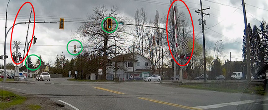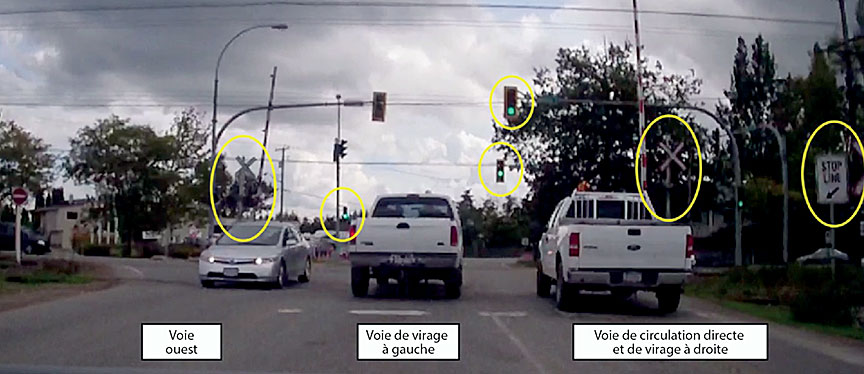 La signalisation à cet endroit présente des difficultés, car l'interconnexion des DSA et du système de feux de circulation routiers doit protéger les véhicules des trains qui passent. Mais il faut également que les feux de circulation assurent la sécurité du passage des véhicules à cette intersection. Lorsque des automobilistes se dirigeant vers l'est reçoivent simultanément un signal d'arrêt des DSA et un feu vert des feux de circulation, il y a des risques de confusion. Par conséquent, il serait souhaitable que Transports Canada, le ministère des Transports et des infrastructures de la Colombie-Britannique et le Chemin de fer Canadien Pacifique examinent la conception et la fonction du passage à niveau à l'intersection Crush Crescent et Glover Road, et examinent l'interconnexion de ses DSA avec le système de signalisation routière, afin de réduire les risques pour les automobilistes à ce passage à niveau.
