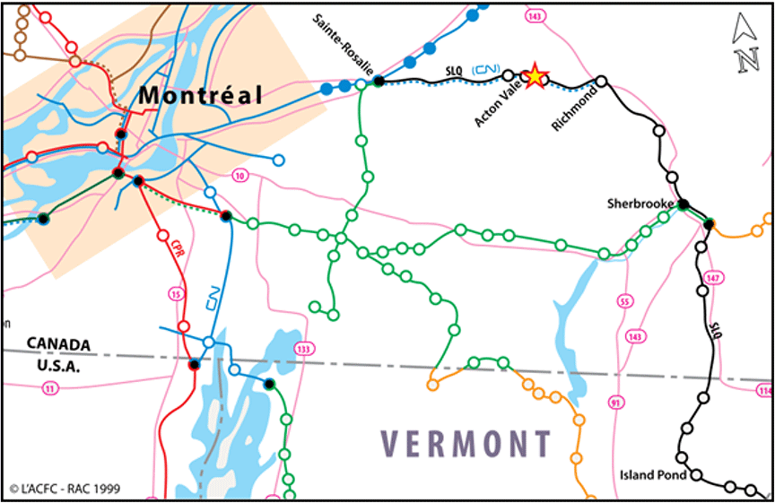 Le jour de l'accident, l'équipe de train n'avait reçu aucune instruction voulant que le branchement ouest de la voie d'évitement à Acton Vale soit en position renversée.